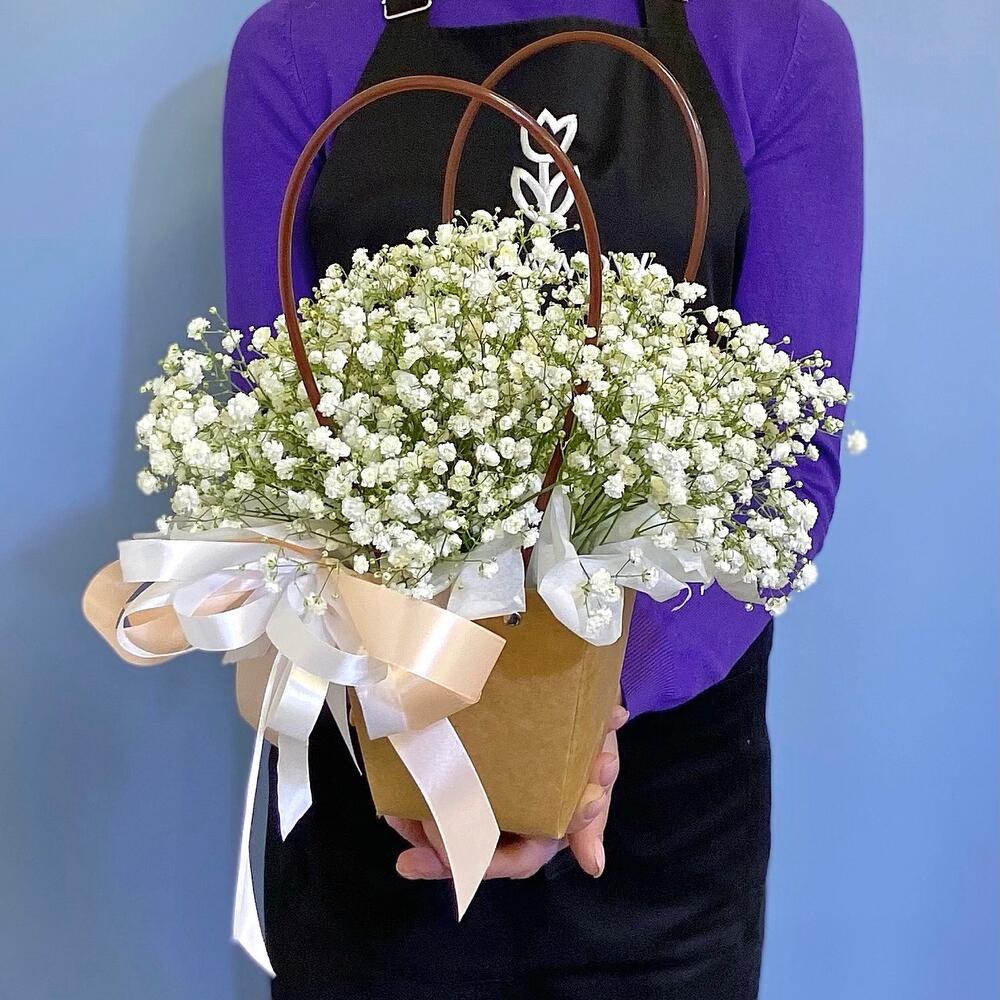 Комплимент с белой гипсофилой в сумочке