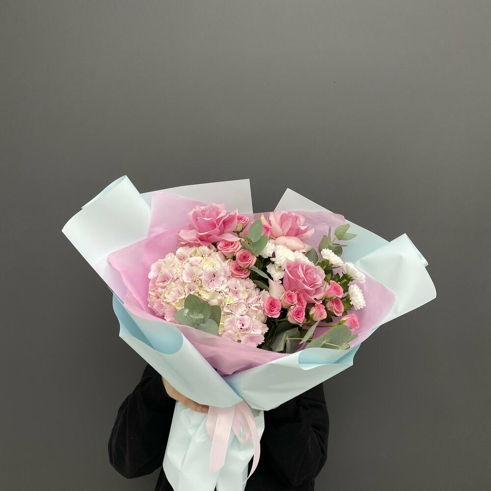 Альстромерии, Гортензии, Кустовые розы, Лизиантусы, Розы, Хризантемы