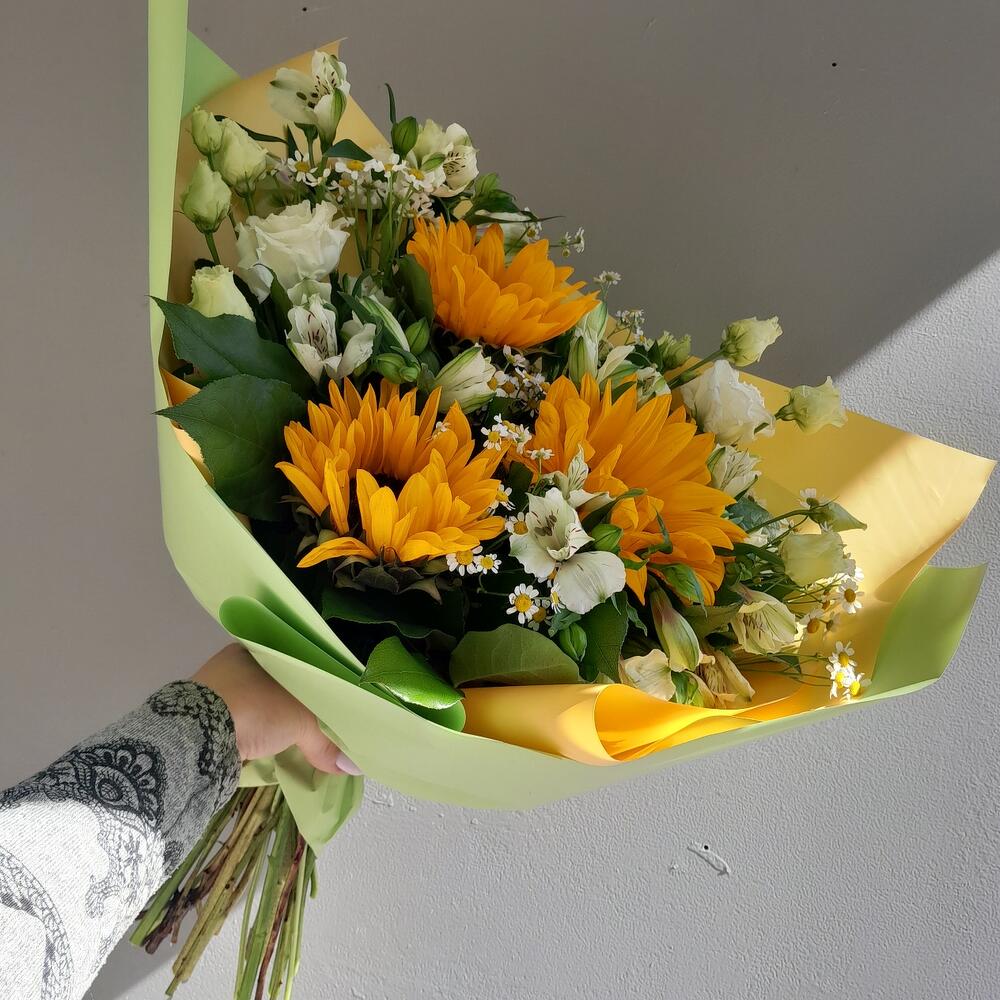 Подсолнух – 3 шт.Эустома – 2 шт.Матрикария (Ромашка Камила) – 5 шт.Альстромерия – 6 шт.Салал – 7 шт.Упаковка дизайнерская – 3 шт.Лента атласная – 2 шт.