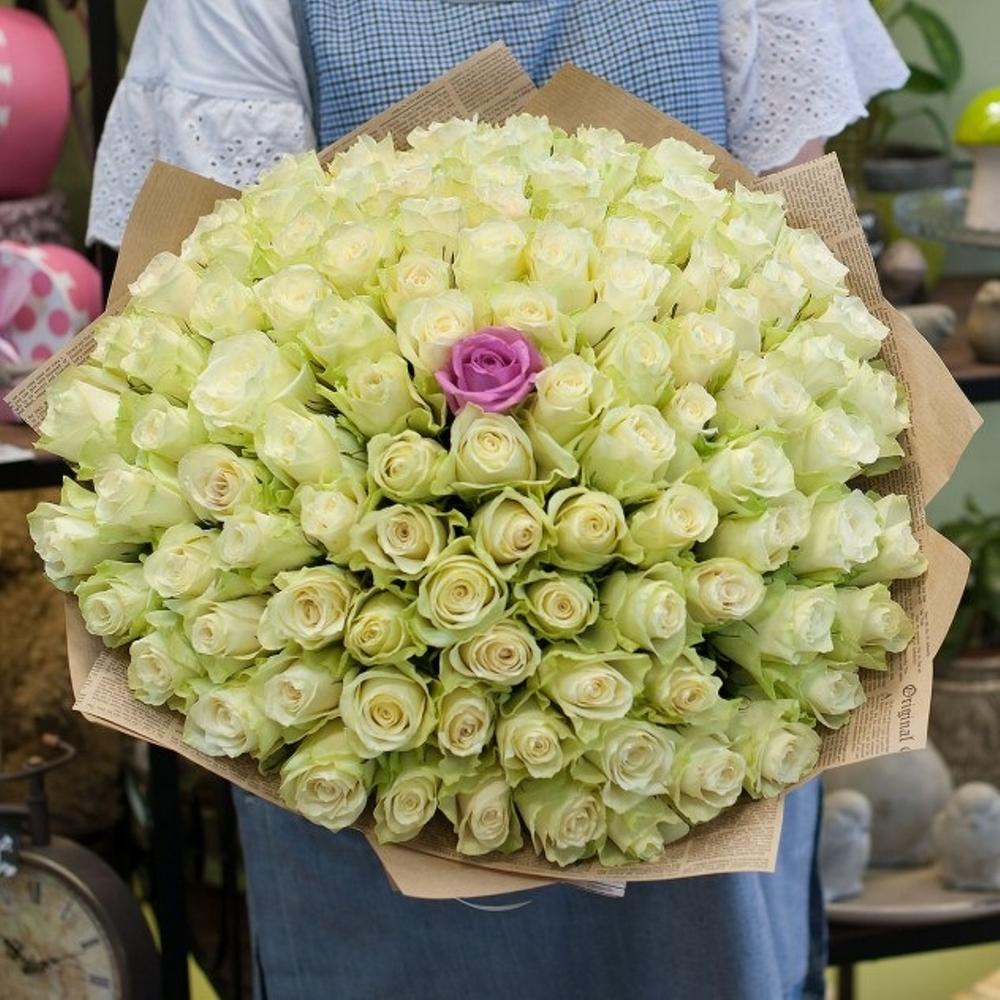 Роза Россия 50 см – 101 шт.Крафт – 3 шт.Лента атласная – 1 шт.