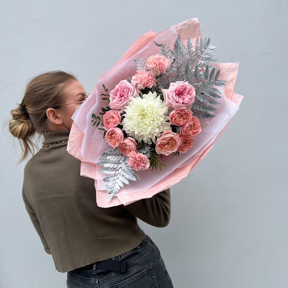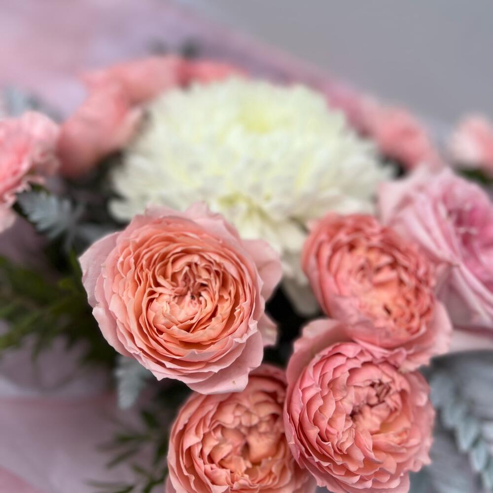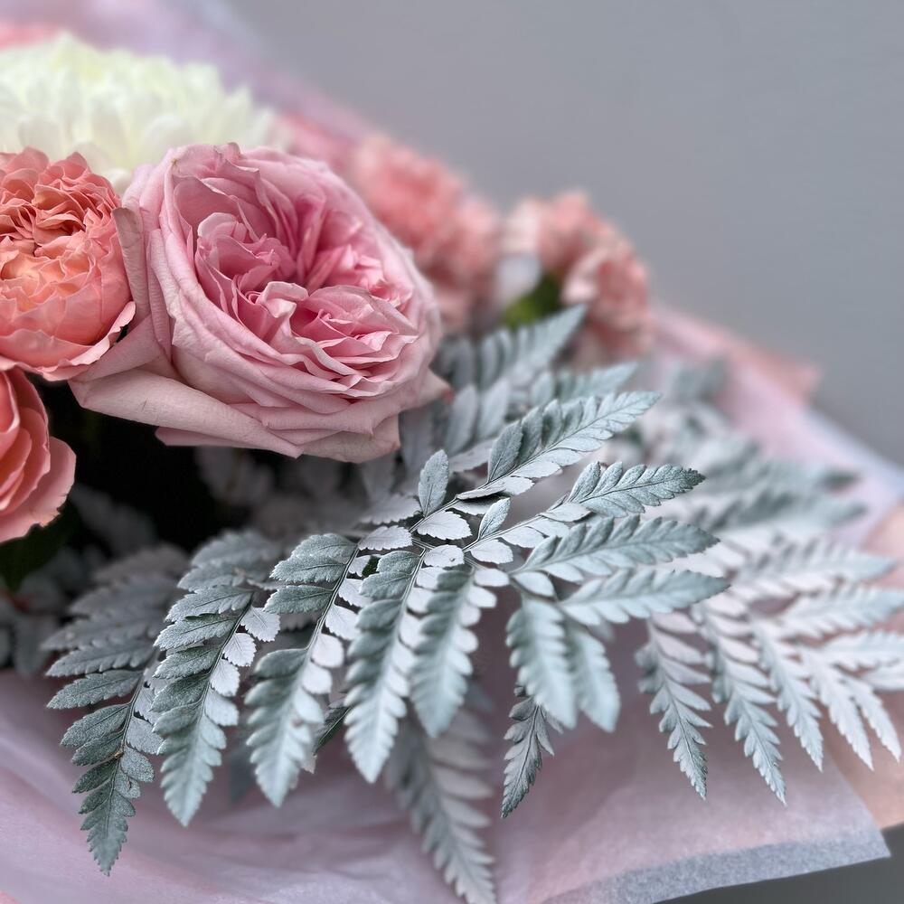 Лента атласная – 1 шт.Тишью – 2 шт.Диантус – 3 шт.Хризантема Антонов – 1 шт.Крафт жатый – 2 шт.Листья папоротника – 3 шт.пионовидная кустовая роза джульетта – 2 шт.пионовидная роза охара – 2 шт.листья фисташки пучок – 1 шт.