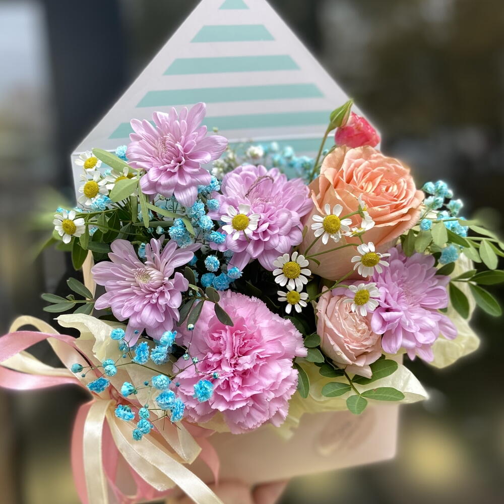 Альстромерии, Гвоздики, Кустовые розы, Лизиантусы, Розы, Хризантемы
