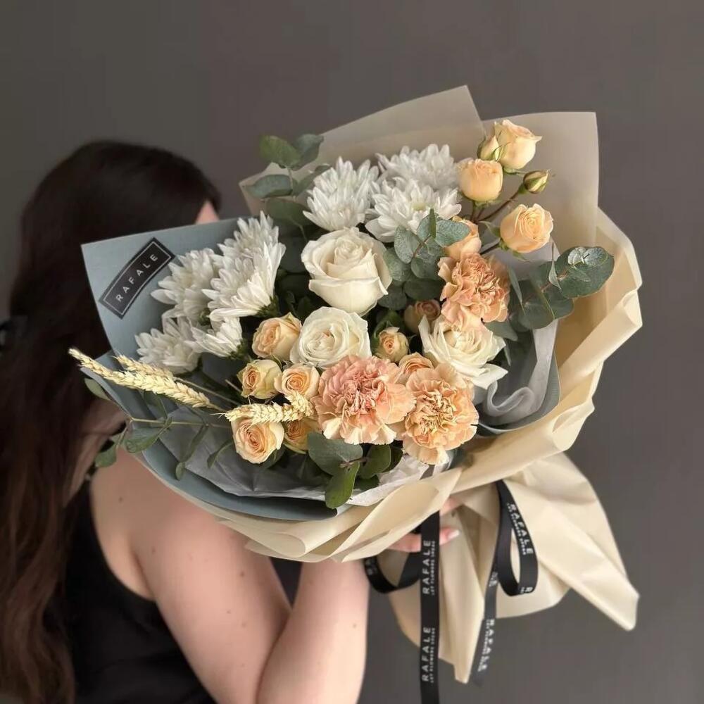 Сборный букет "EURO 18.3" состоит из голландских роз, гвоздик, кустовых хризантем, спрей роз, эвкалипта и пшеницы в оформлении. Выбрав букет от RAFALE, Вы скрасите день обладательницы букета и подарите ей незабываемые эмоции.