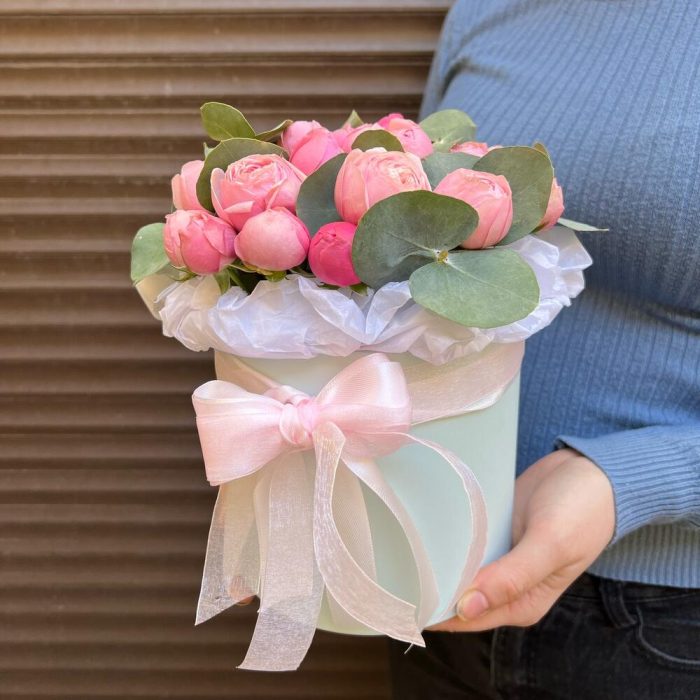 Эвкалипт – 5 шт.Лента атласная – 2 шт.Тишью – 1 шт.Оазис флористический – 1 шт.коробка шляпная s – 1 шт.сильва пинк кустовая роза – 5 шт.