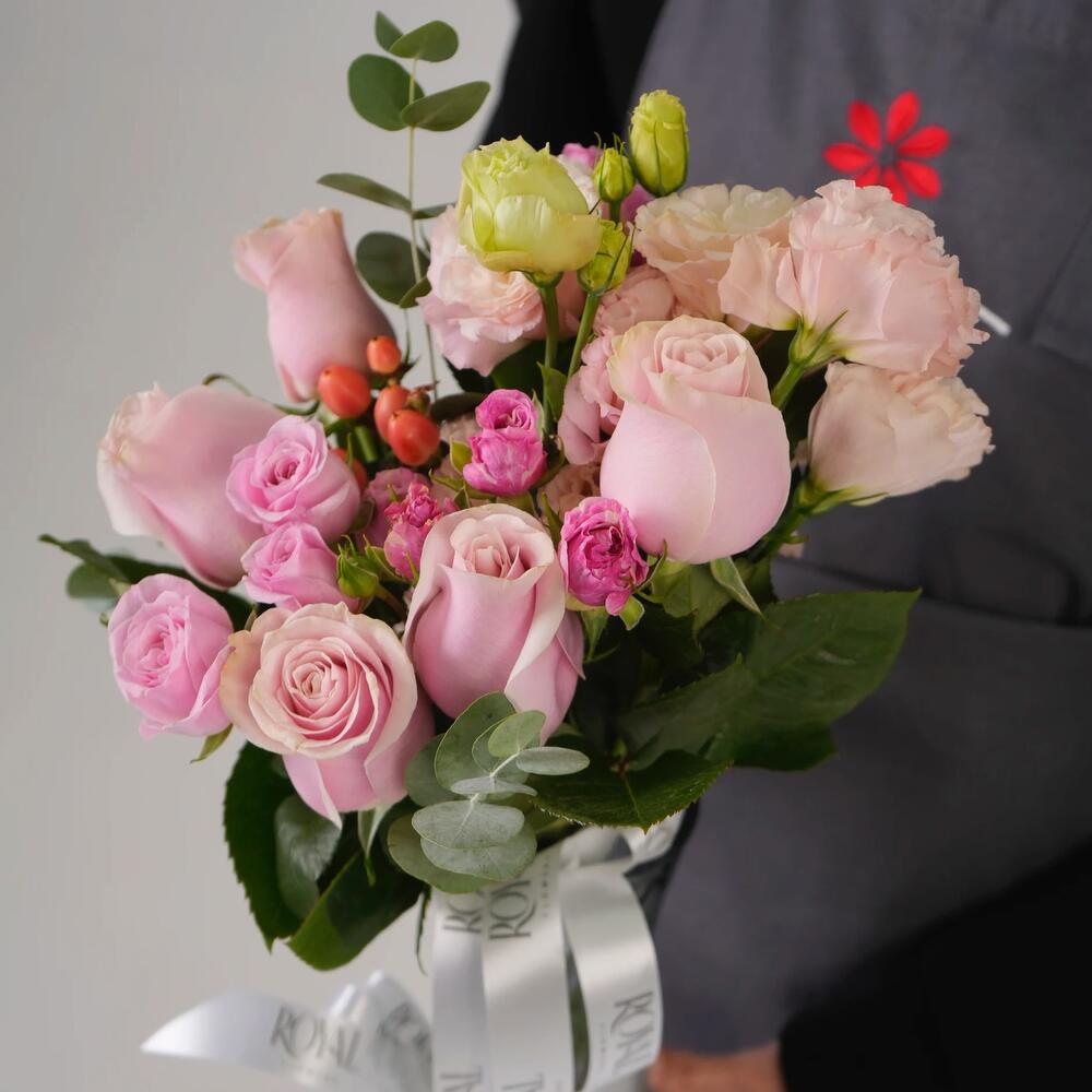 Альстромерии, Гвоздики, Кустовые розы, Лизиантусы, Розы, Хризантемы
