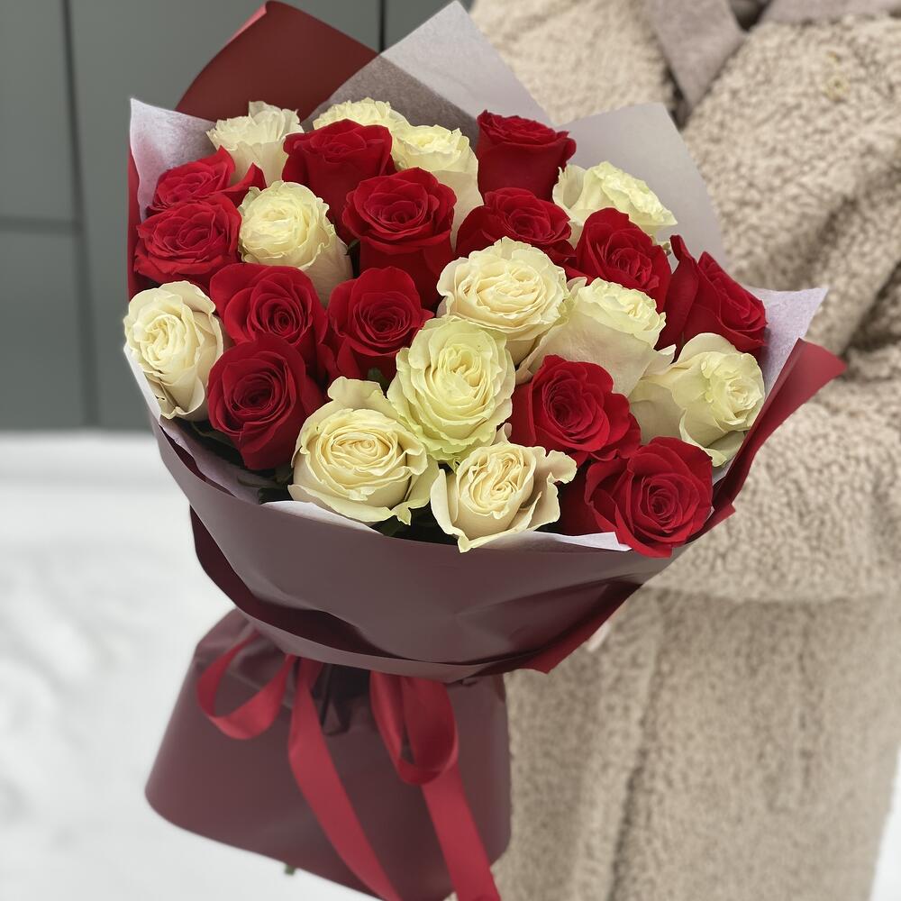 Влюбленный взгляд из 25 красных и белых роз в оформлении