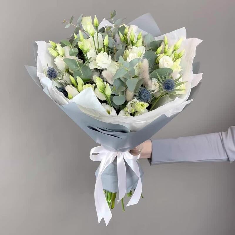 Эрингиум – 3 шт.Лента атласная – 1 шт.Лагурус – 15 шт.Дизайнерская упаковка – 2 шт.эустома ду росита белая – 7 шт.